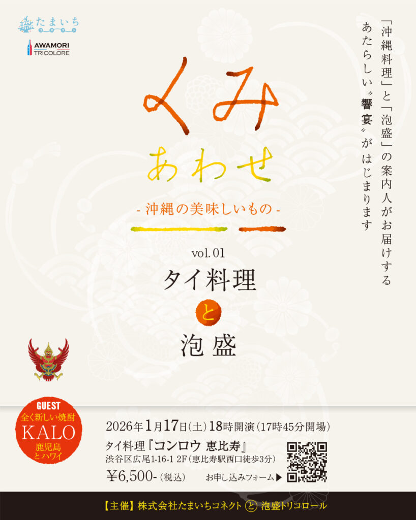 「沖縄料理(琉球料理)」を語るたまいちコネクトと、「泡盛」案内人の泡盛トリコールがお届けする食とお酒をくみあわせるイベント。